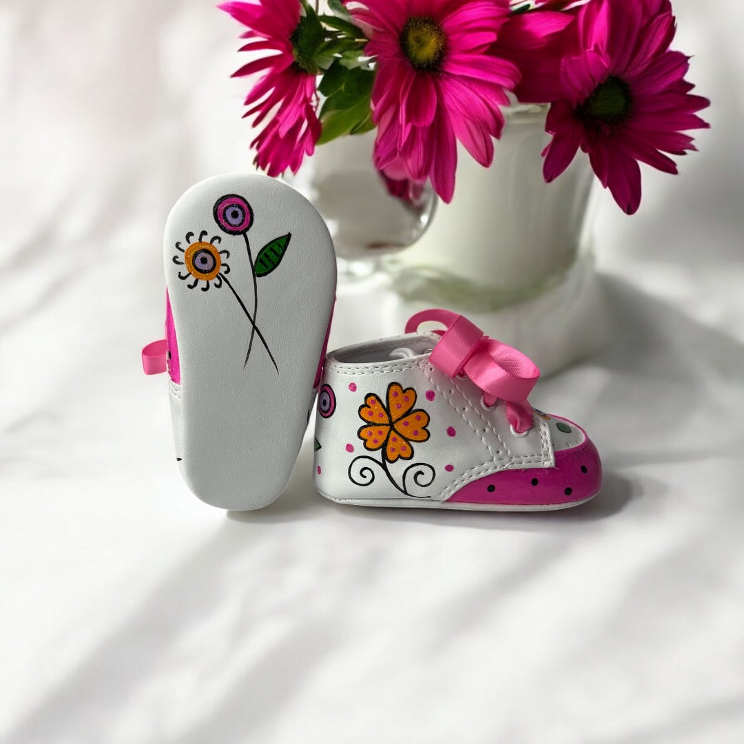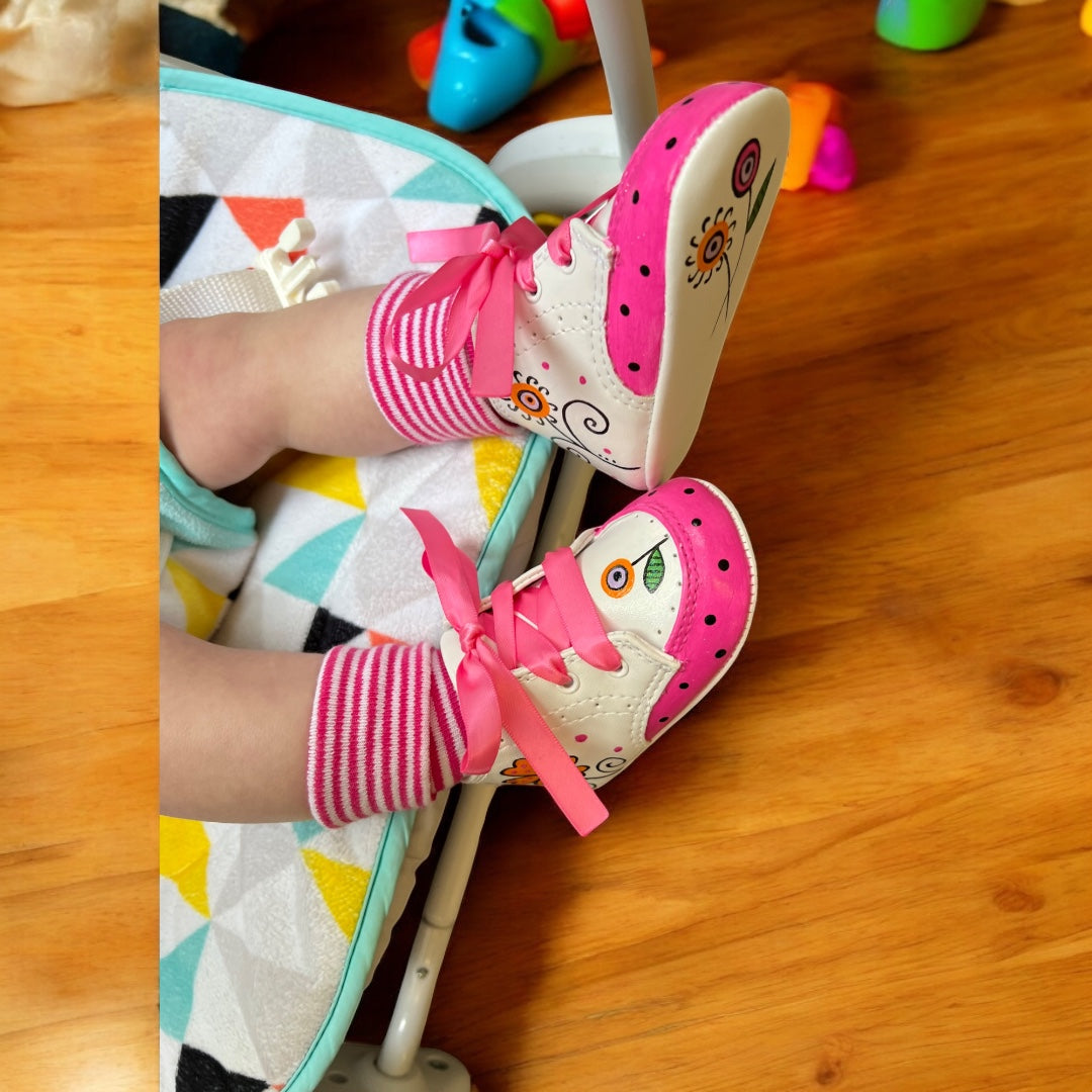 Slip into whimsical flower power with our Fancy Nancy baby shoes! These adorable kicks feature a bright and playful blend of orange and hot pink, sure to make a stylish statement. So let your little one's feet bloom with style and fun!