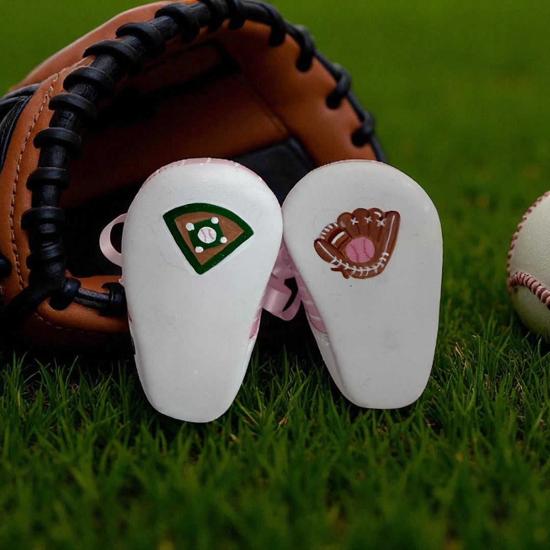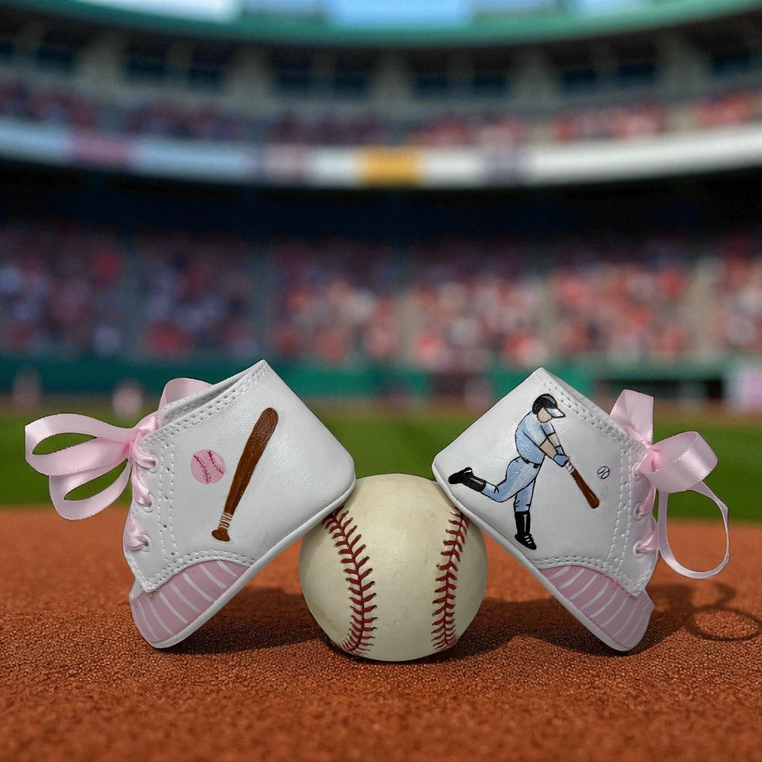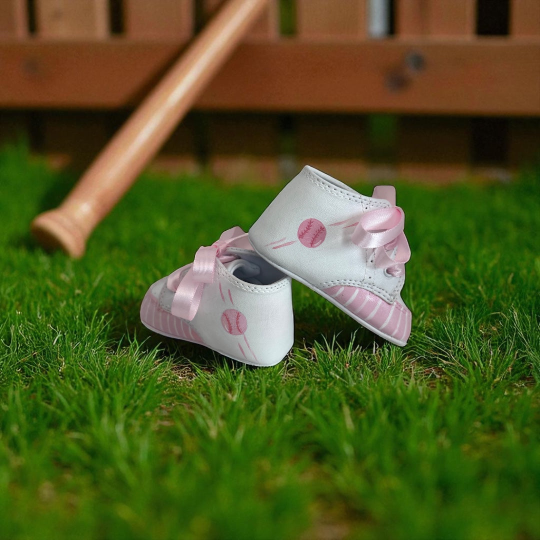 Batter up baby!!! These sporty little shoes are a grand slam of cuteness! Little baseballs, mini mitt and a player up to bat. Finished in subtle pinks with a hint of sparkle and soft satin ribbon laces, your little one will be a true MVP.